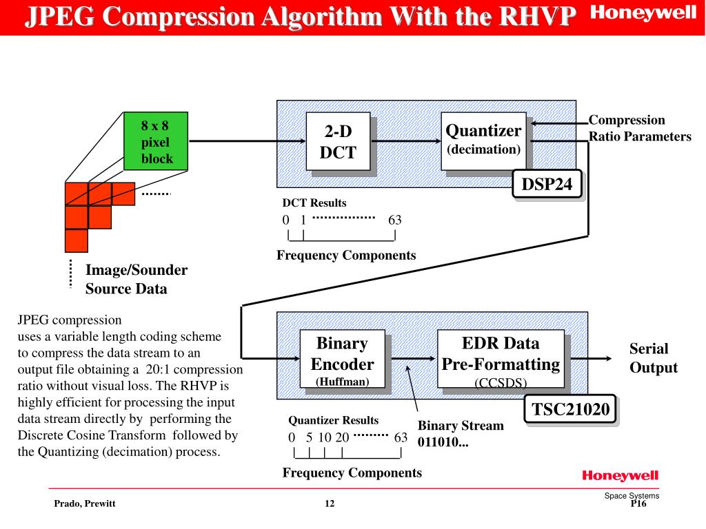 JPEG Compression Algorithm With the RHVP DSP24 DCT Results 0 1 63 Frequency Components TSC21020 Quantizer Results 0 5 10 20 63 Frequency Components Compression Ratio Parameters 8 x 8 pixel block Quantizer (decimation) 2-D DCT Image/Sounder Source Data JPEG compression uses a variable length coding scheme to compress the data stream to an output file obtaining a 20:1 compression ratio without visual loss. The RHVP is highly efficient for processing the input data stream directly by performing the Discrete Cosine Transform followed by the Quantizing (decimation) process. Binary Encoder (Huffman) EDR Data Pre-Formatting (CCSDS) Serial Output Binary Stream 011010...
