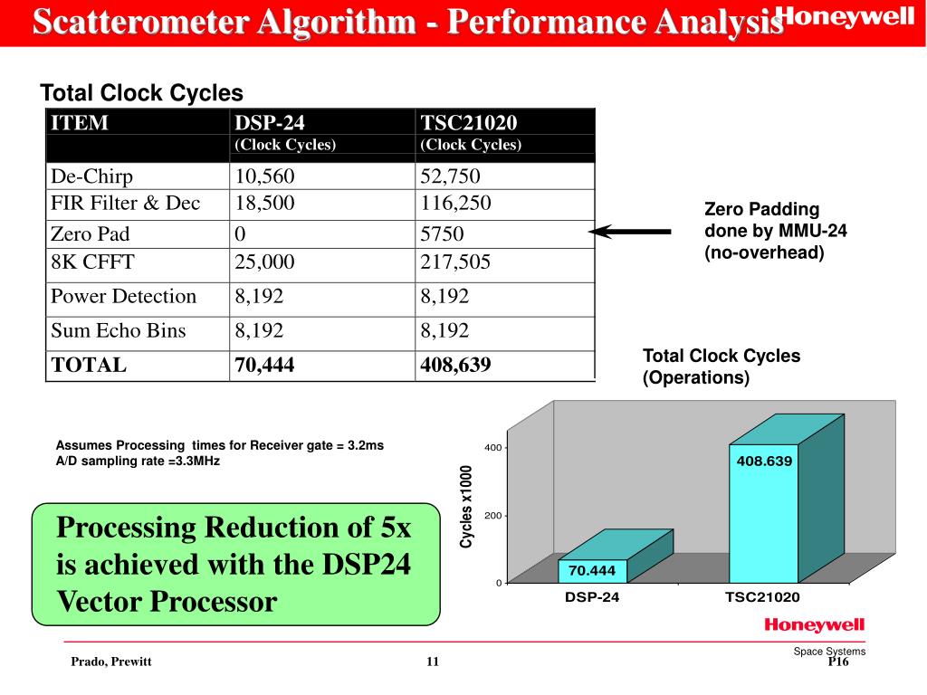 Scatterometer Algorithm - Performance Analysis Total Clock Cycles Zero Padding done by MMU-24 (no-overhead) Total Clock Cycles (Operations) Assumes Processing times for Receiver gate = 3.2ms A/D sampling rate =3.3MHz Processing Reduction of 5x is achieved with the DSP24 Vector Processor