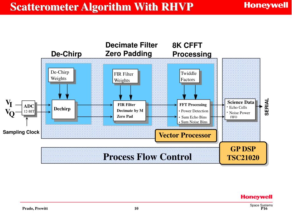 Scatterometer Algorithm With RHVP Decimate Filter 8K CFFT Processing Zero Padding De-Chirp De-Chirp Twiddle FIR Filter Weights Factors Weights V Science Data I FIR Filter FFT Processing ADC SERIAL • Echo Cells Dechirp V Decimate by M Power Detection • 12-BIT Q • Noise Power Zero Pad Sum Echo Bins • FIFO Sum Noise Bins • Sampling Clock Vector Processor GP DSP TSC21020 Process Flow Control