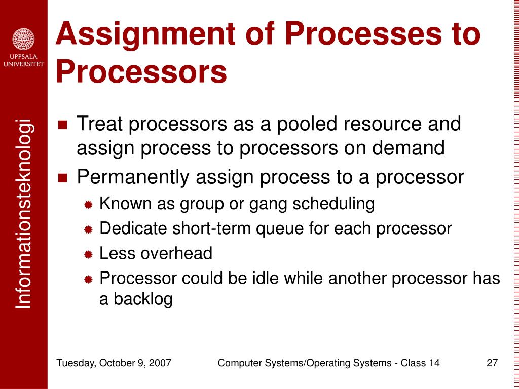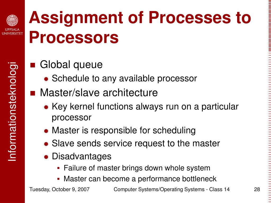 Assignment of Processes to Processors • Global queue • Schedule to any available processor • Master/slave architecture • Key kernel functions always run on a particular processor • Master is responsible for scheduling • Slave sends service request to the master • Disadvantages • Failure of master brings down whole system • Master can become a performance bottleneck Computer Systems/Operating Systems - Class 14