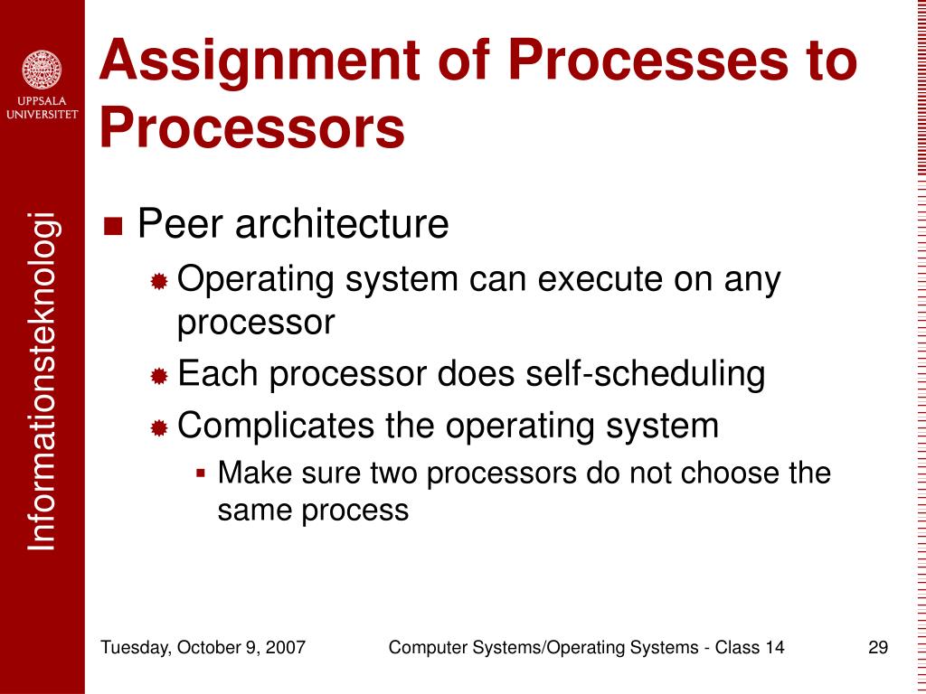 Assignment of Processes to Processors • Peer architecture • Operating system can execute on any processor • Each processor does self-scheduling • Complicates the operating system • Make sure two processors do not choose the same process Computer Systems/Operating Systems - Class 14