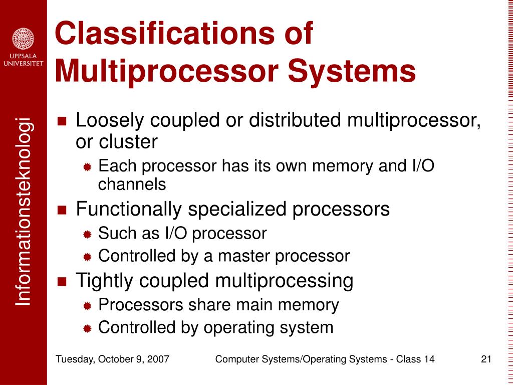 Classifications of Multiprocessor Systems • Loosely coupled or distributed multiprocessor, or cluster • Each processor has its own memory and I/O channels • Functionally specialized processors • Such as I/O processor • Controlled by a master processor • Tightly coupled multiprocessing • Processors share main memory • Controlled by operating system Computer Systems/Operating Systems - Class 14