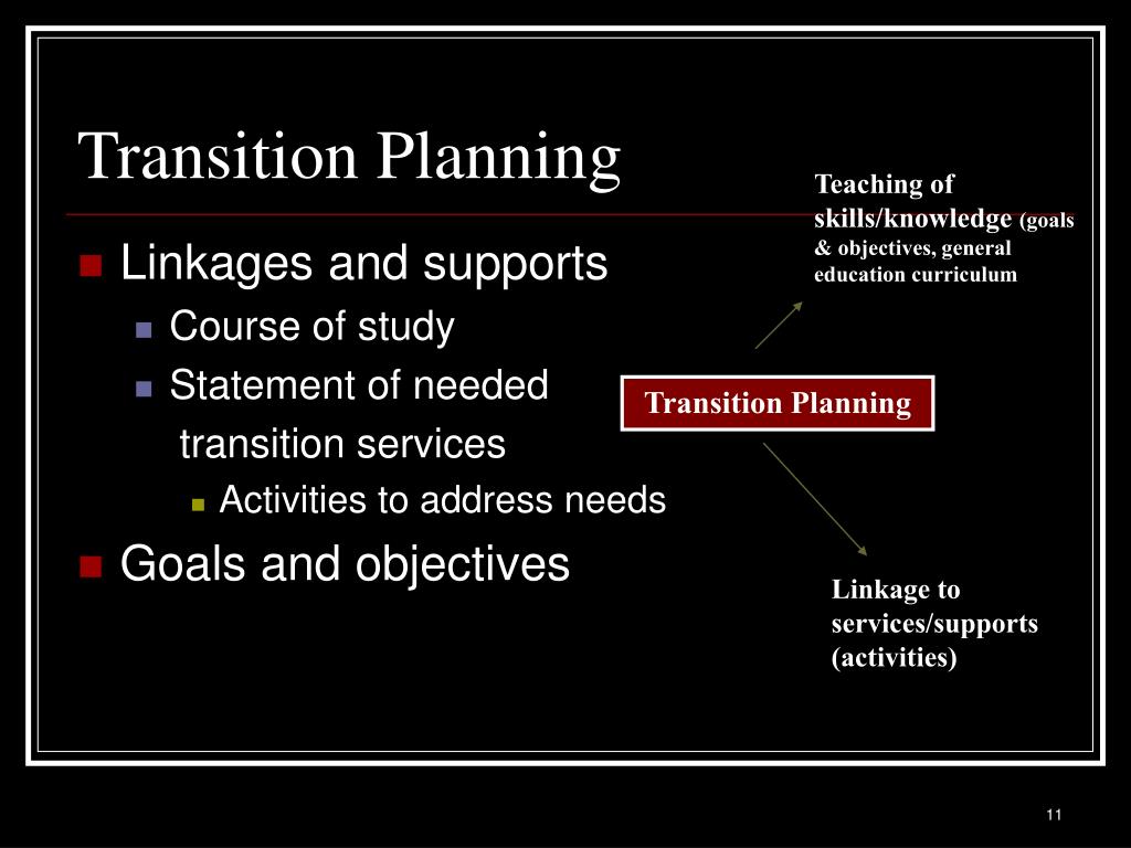 Transition Planning Teaching of skills/knowledge (goals & objectives, general education curriculum) • Linkages and supports • Course of study • Statement of needed transition services • Activities to address needs • Goals and objectives Transition Planning Linkage to services/supports (activities)