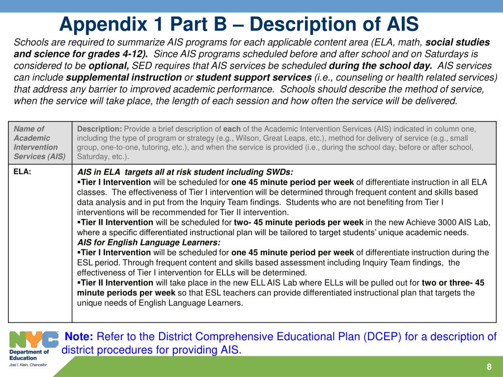 Appendix 1 Part B – Description of AIS Note: Refer to the District Comprehensive Educational Plan (DCEP) for a description of district procedures for providing AIS. Schools are required to summarize AIS programs for each applicable content area (ELA, math, social studies and science for grades 4-12). Since AIS programs scheduled before and after school and on Saturdays is considered to be optional, SED requires that AIS services be scheduled during the school day. AIS services can include supplemental instruction or student support services (i.e., counseling or health related services) that address any barrier to improved academic performance. Schools should describe the method of service, when the service will take place, the length of each session and how often the service will be delivered. 8