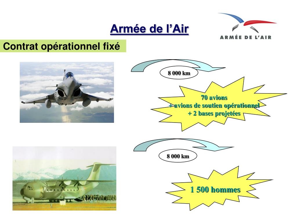 Armée de l’Air Contrat opérationnel fixé 8 000 km 70 avions + avions de soutien opérationnel + 2 bases projetées 8 000 km 1 500 hommes