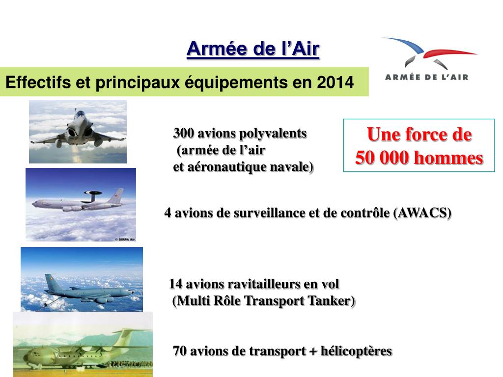 Armée de l’Air Effectifs et principaux équipements en 2014 Une force de 50 000 hommes 300 avions polyvalents (armée de l’air et aéronautique navale) 4 avions de surveillance et de contrôle (AWACS) 14 avions ravitailleurs en vol (Multi Rôle Transport Tanker) 70 avions de transport + hélicoptères