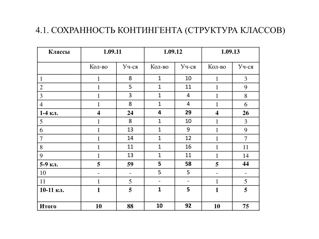 4. Контингент ОУ 4.1. сохранность контингентаНа 31.05.2014 г. количество обучающихся -88 человек. Случаи исключения из школы отсутствуют. Школа реализует очную форму обучения в 1 смену при шестидневной неделе для 2-11 классов и пятидневной для 1 класса. Организован подвоз обучающихся школьным автобусом из близлежащих населенных пунктов: Старая Александровка, Калмурзино, Аю, Дыреевка, Богдановка, Степановка.