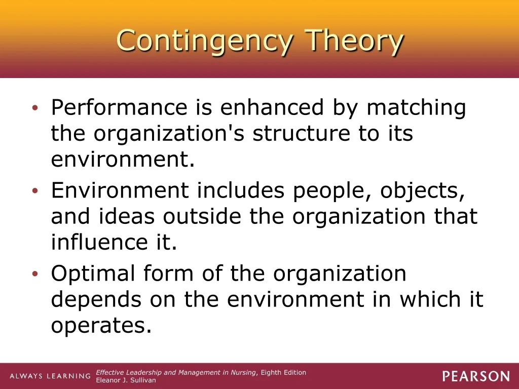 Contingency Theory • Performance is enhanced by matching the organization's structure to its environment. • Environment includes people, objects, and ideas outside the organization that influence it. • Optimal form of the organization depends on the environment in which it operates.