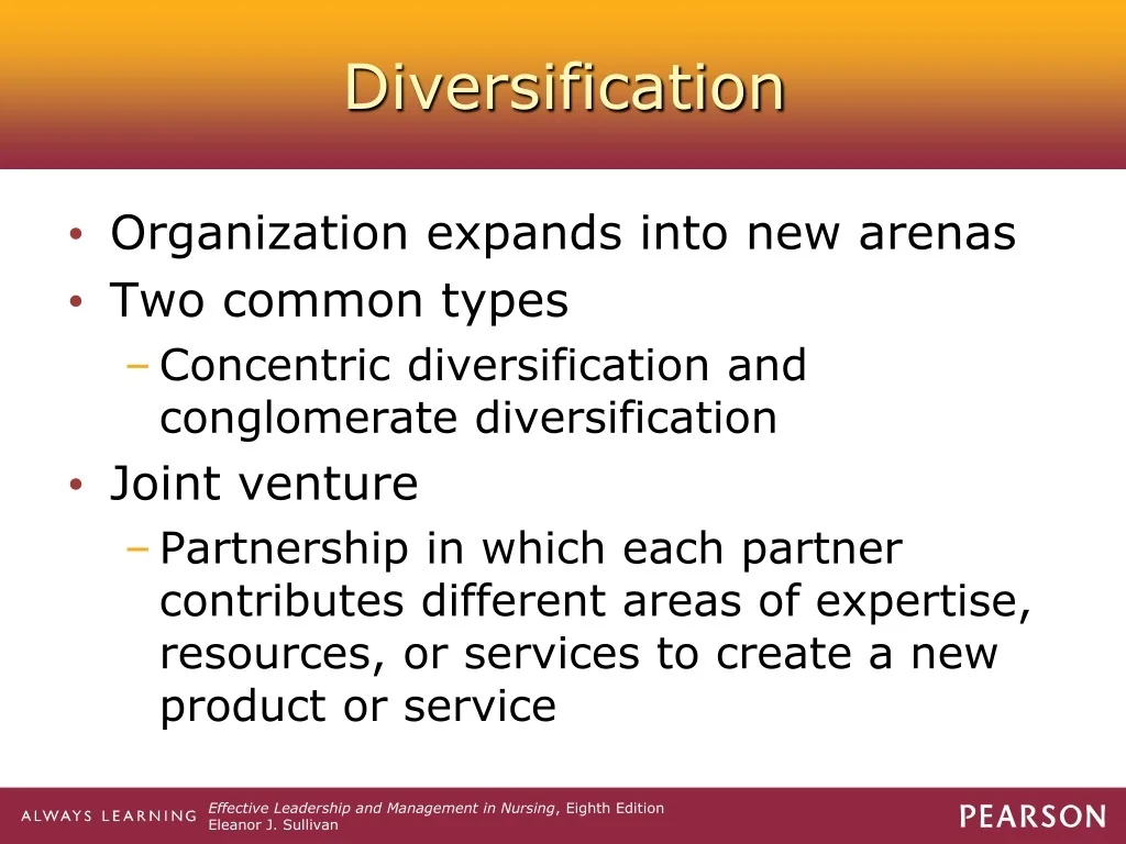 Diversification • Organization expands into new arenas • Two common types • Concentric diversification and conglomerate diversification • Joint venture • Partnership in which each partner contributes different areas of expertise, resources, or services to create a new product or service