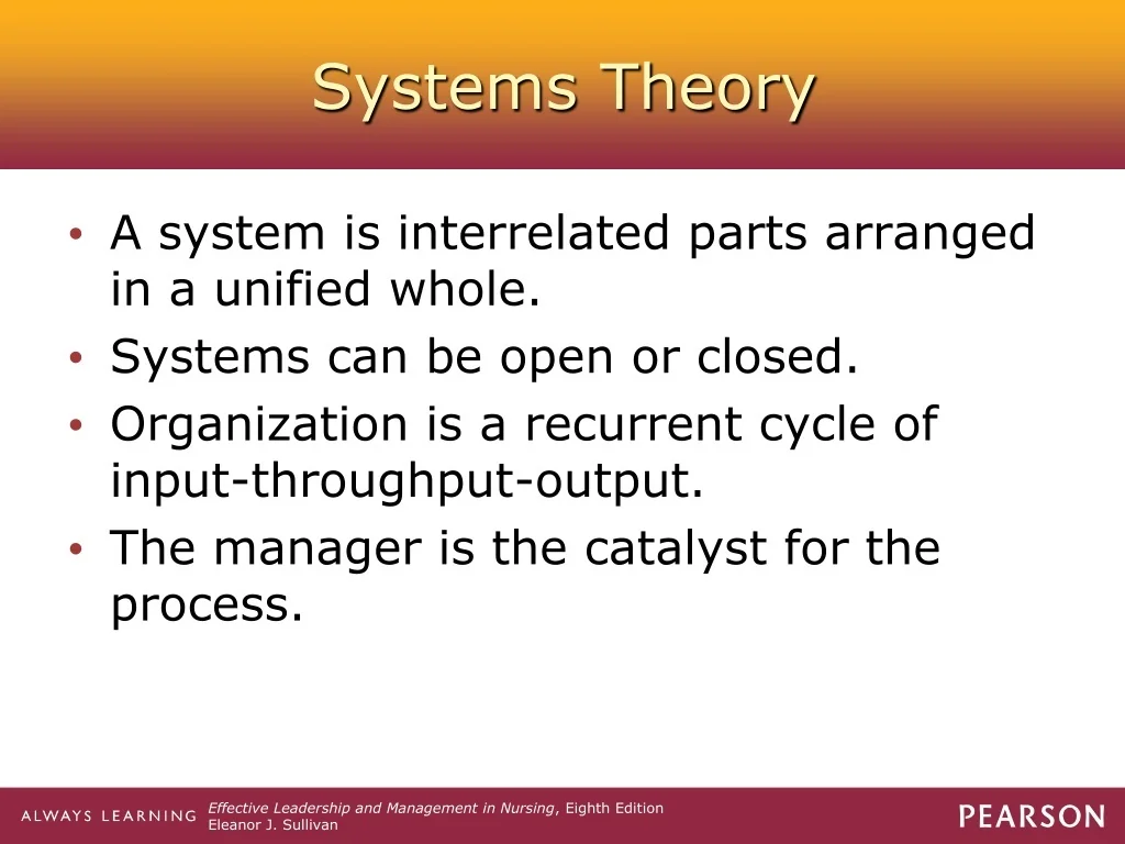 Systems Theory • A system is interrelated parts arranged in a unified whole. • Systems can be open or closed. • Organization is a recurrent cycle of input-throughput-output. • The manager is the catalyst for the process.