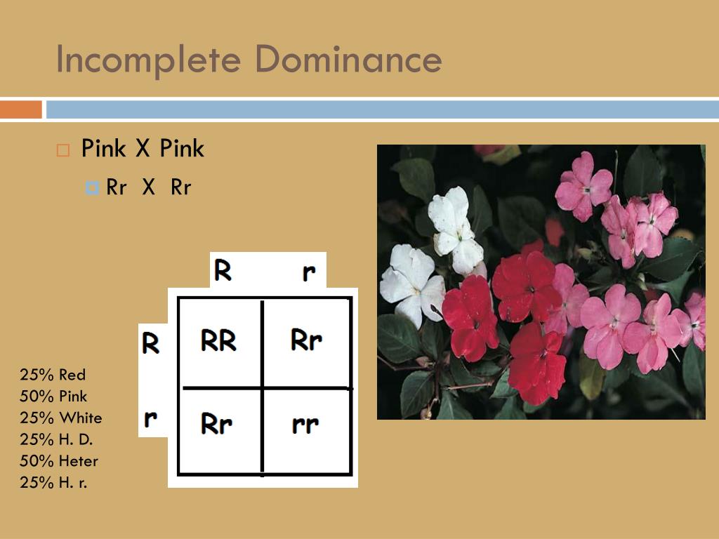 Incomplete Dominance • Pink X Pink • Rr X Rr 25% Red 50% Pink 25% White 25% H. D. 50% Heter 25% H. r.
