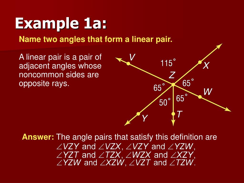 Answer: The angle pairs that satisfy this definition are Example 1a: Name two angles that form a linear pair. A linear pair is a pair of adjacent angles whose noncommon sides are opposite rays.