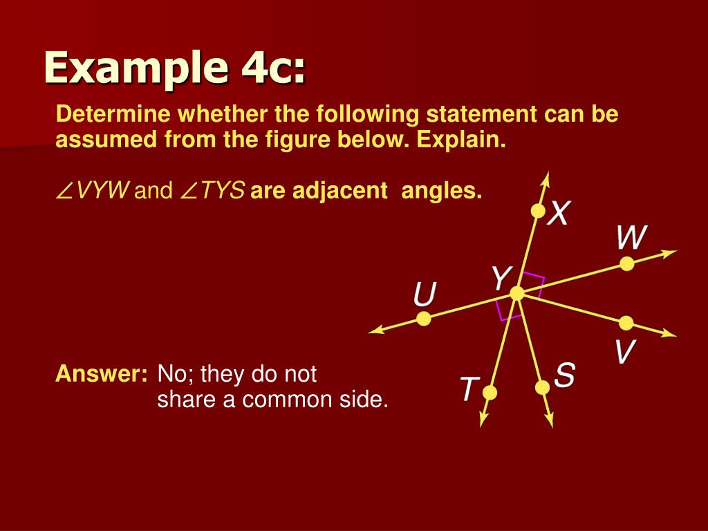 Example 4c: Determine whether the following statement can be assumed from the figure below. Explain.VYW and TYSare adjacent angles. Answer: No; they do not share a common side.