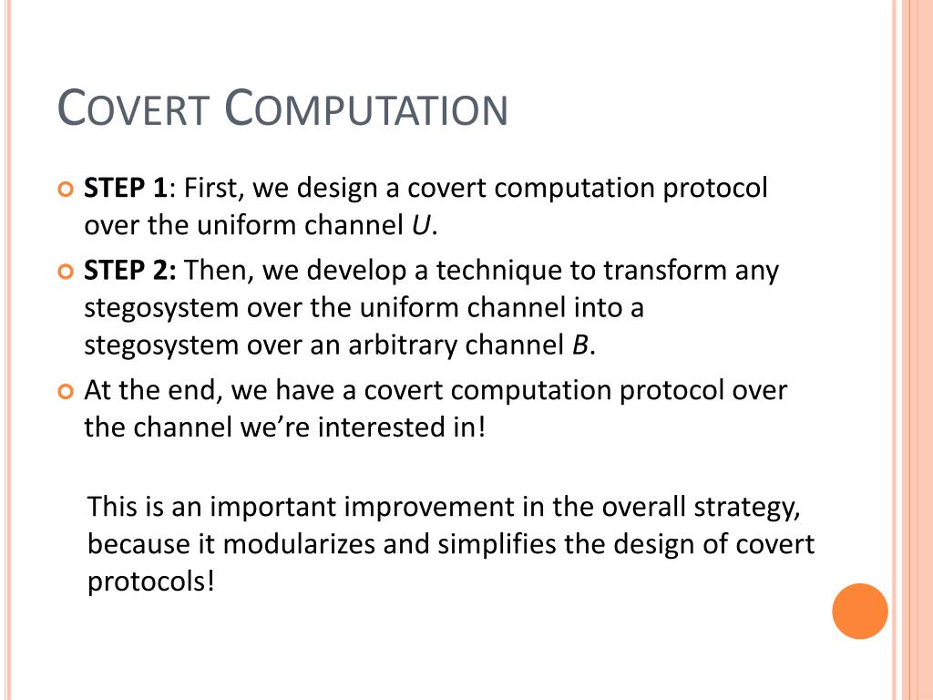 Covert Computation • STEP 1: First, we design a covert computation protocol over the uniform channel U. • STEP 2: Then, we develop a technique to transform any stegosystem over the uniform channel into a stegosystem over an arbitrary channel B. • At the end, we have a covert computation protocol over the channel we’re interested in! This is an important improvement in the overall strategy, because it modularizes and simplifies the design of covert protocols!