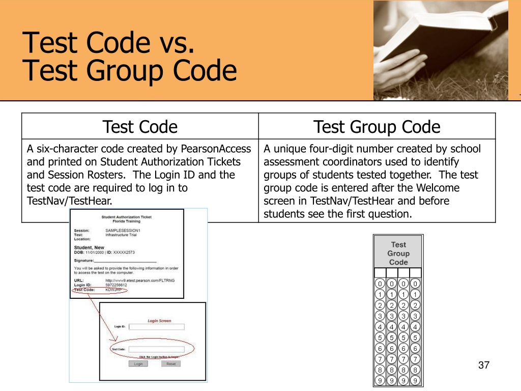 Test Group Code • A test group code is a unique four-digit number used as a security measure to identify groups of students tested together. • Each testing room must utilize a different test group code. • Students will enter the test group code before beginning the test, as indicated in the scripts. • The same test group code is used for Session 1 and 2. • If students are absent for a test session, a different unique code must be used for each make-up session. • The code must be recorded on the required administration information and on each seating chart.