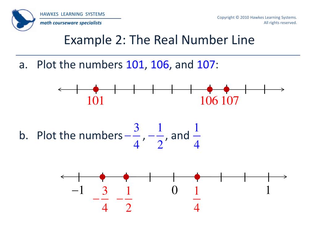 Example 2: The Real Number Line • Plot the numbers 101, 106, and 107: • Plot the numbers , , and | | | | | | | | | | | | | | | | | | | |