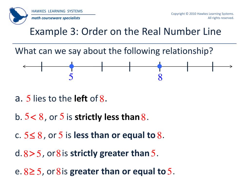 Example 3: Order on the Real Number Line What can we say about the following relationship? | | | | | | | a. lies to the left of . b. , or is strictly less than . c. , or is less than or equal to . d. , or is strictly greater than . e. , or is greater than or equal to .