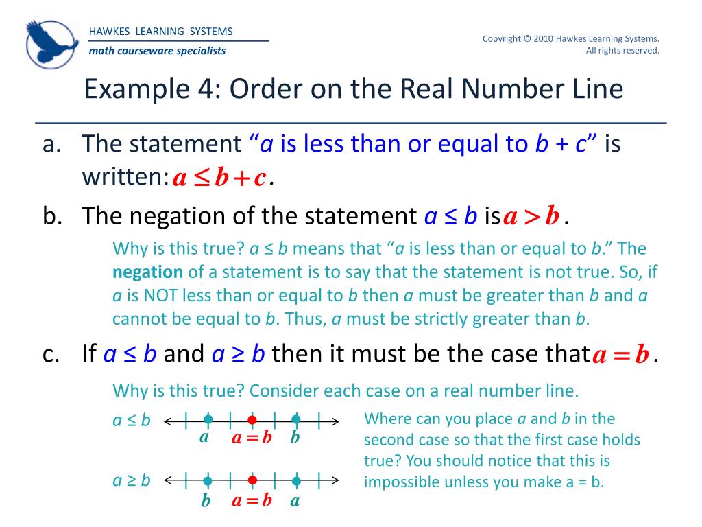 Order on the Real Number Line Symbol Read “a is less than b” “a is less than or equal to b” “b is greater than a” “b is greater than or equal to a” Meaning alies to the left of b on the number line. a lies to the left of b or is equal to b. b lies to the right of a on the number line. b lies to the right of a or is equal to a. The two symbols < and > are called strict inequality signs, while the symbols ≤ and ≥ are non-strict inequality signs.