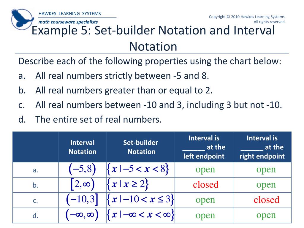 Example 5: Set-builder Notation and Interval Notation Describe each of the following properties using the chart below: • All real numbers strictly between -5 and 8. • All real numbers greater than or equal to 2. • All real numbers between -10 and 3, including 3 but not -10. • The entire set of real numbers.