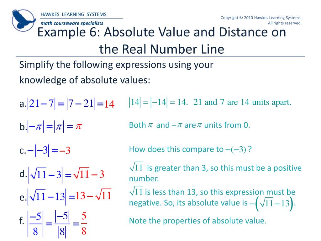 Hawkes Learning Systems: College Algebra. Section 1.1: The Real Number System. Objectives. Common subsets of real numbers. The real number line. Order on the real number line. Set-builder notation and interval notation. Absolute value and distance on the real number line.