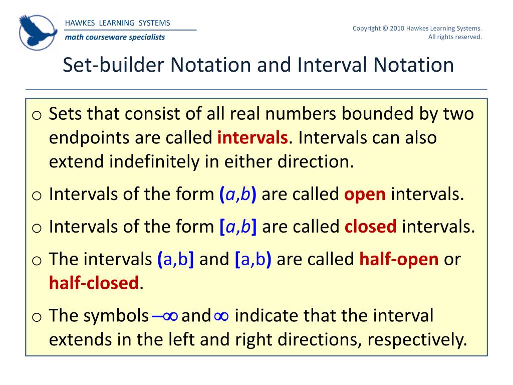 Set-builder Notation and Interval Notation • Sets that consist of all real numbers bounded by two endpoints are called intervals. Intervals can also extend indefinitely in either direction. • Intervals of the form (a,b) are called open intervals. • Intervals of the form [a,b]are called closed intervals. • The intervals (a,b]and [a,b)are called half-open or half-closed. • The symbols and indicate that the interval extends in the left and right directions, respectively.