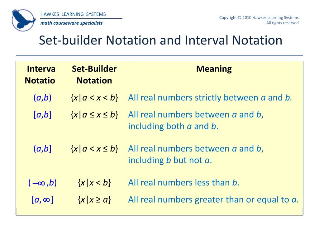 Set-builder Notation and Interval Notation Interval Notation (a,b) [a,b] (a,b] ( ,b) [a, ] Set-Builder Notation {x|a < x < b} {x|a ≤ x ≤ b} {x|a < x ≤ b} {x|x < b} {x|x ≥ a} Meaning All real numbers strictly between a and b. All real numbers between a and b, including both a and b. All real numbers between a and b, including b but not a. All real numbers less than b. All real numbers greater than or equal to a.