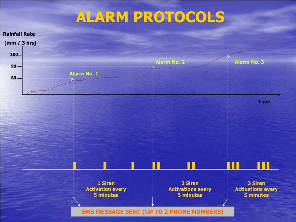 ALARM PROTOCOLS Rainfall Rate (mm / 3 hrs) 100 Alarm No. 2 Alarm No. 3 90 Alarm No. 1 80 Time 1 Siren Activation every 5 minutes 2 Siren Activations every 5 minutes 3 Siren Activations every 5 minutes SMS MESSAGE SENT (UP TO 2 PHONE NUMBERS)
