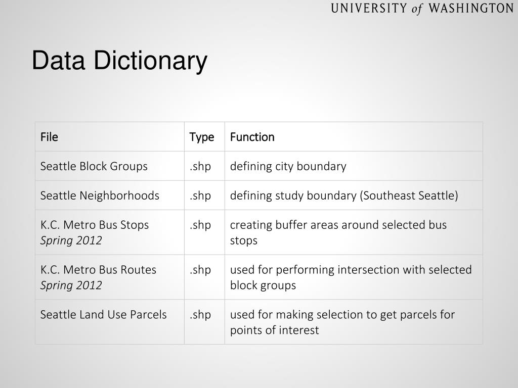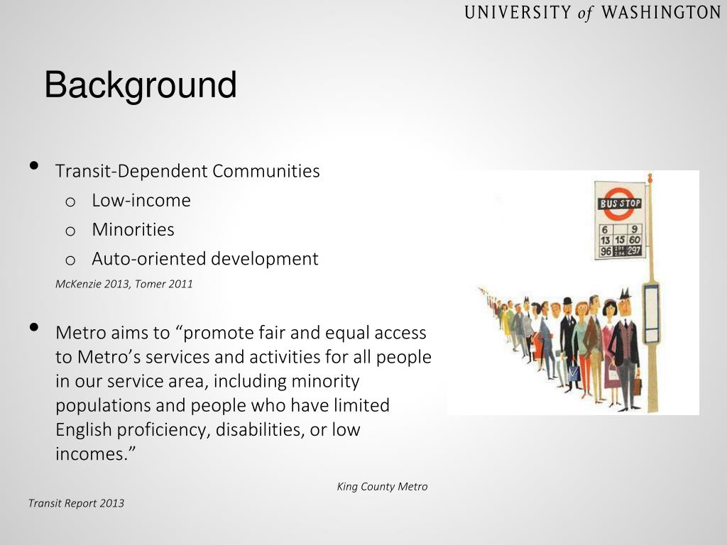 Background • Transit-Dependent Communities • Low-income • Minorities • Auto-oriented development McKenzie 2013, Tomer 2011 • Metro aims to “promote fair and equal access to Metro’s services and activities for all people in our service area, including minority populations and people who have limited English proficiency, disabilities, or low incomes.” • King County Metro Transit Report 2013