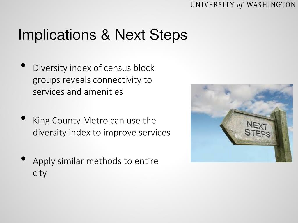 Implications & Next Steps • Diversity index of census block groups reveals connectivity to services and amenities • King County Metro can use the diversity index to improve services • Apply similar methods to entire city