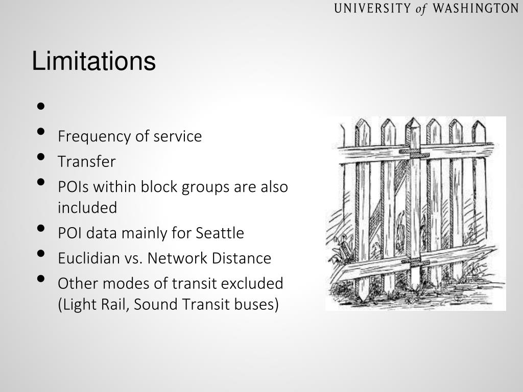 Limitations • Frequency of service • Transfer • POIs within block groups are also included • POI data mainly for Seattle • Euclidian vs. Network Distance • Other modes of transit excluded (Light Rail, Sound Transit buses)