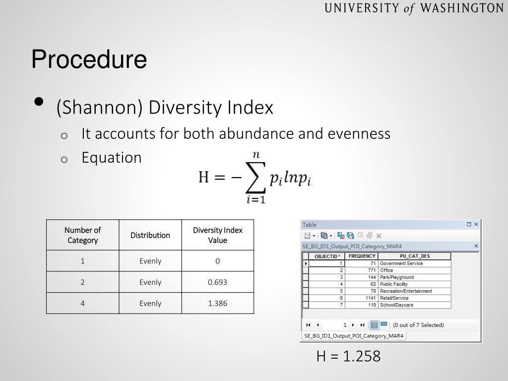 Procedure • (Shannon) Diversity Index • It accounts for both abundance and evenness • Equation H = 1.258