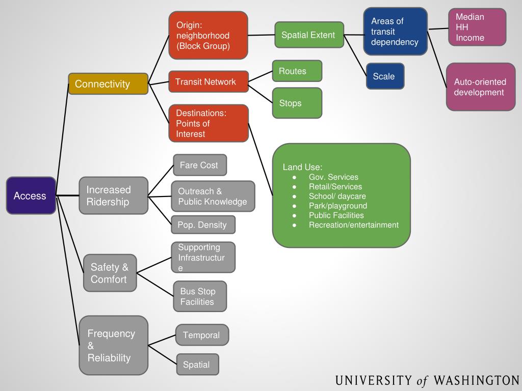 Areas of transit dependency Median HH Income Origin: neighborhood (Block Group) Spatial Extent Routes Auto-oriented development Scale Transit Network Connectivity Stops Destinations: Points of Interest Land Use: • Gov. Services • Retail/Services • School/ daycare • Park/playground • Public Facilities • Recreation/entertainment Fare Cost Access Increased Ridership Outreach & Public Knowledge Pop. Density Supporting Infrastructure Safety & Comfort Bus Stop Facilities Frequency & Reliability Temporal Spatial