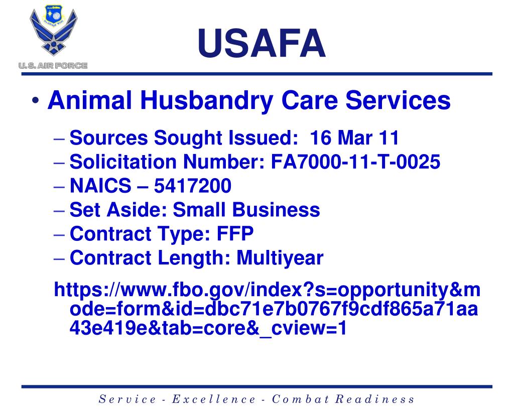 USAFA • Animal Husbandry Care Services • Sources Sought Issued: 16 Mar 11 • Solicitation Number: FA7000-11-T-0025 • NAICS – 5417200 • Set Aside: Small Business • Contract Type: FFP • Contract Length: Multiyear https://www.fbo.gov/index?s=opportunity&mode=form&id=dbc71e7b0767f9cdf865a71aa43e419e&tab=core&_cview=1