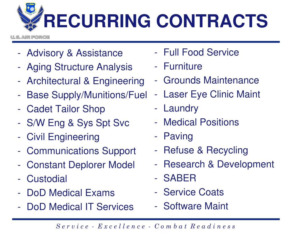 RECURRING CONTRACTS • Full Food Service • Furniture • Grounds Maintenance • Laser Eye Clinic Maint • Laundry • Medical Positions • Paving • Refuse & Recycling • Research & Development • SABER • Service Coats • Software Maint • Advisory & Assistance • Aging Structure Analysis • Architectural & Engineering • Base Supply/Munitions/Fuel • Cadet Tailor Shop • S/W Eng & Sys Spt Svc • Civil Engineering • Communications Support • Constant Deplorer Model • Custodial • DoD Medical Exams • DoD Medical IT Services