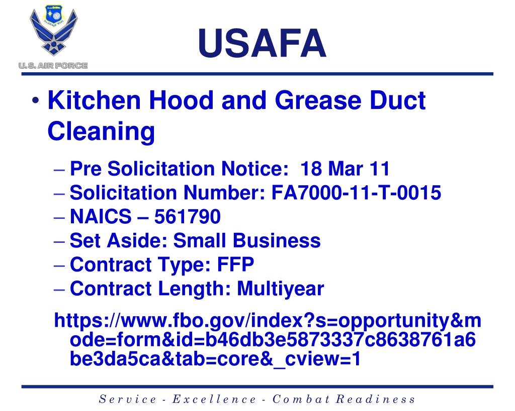 USAFA • Kitchen Hood and Grease Duct Cleaning • Pre Solicitation Notice: 18 Mar 11 • Solicitation Number: FA7000-11-T-0015 • NAICS – 561790 • Set Aside: Small Business • Contract Type: FFP • Contract Length: Multiyear https://www.fbo.gov/index?s=opportunity&mode=form&id=b46db3e5873337c8638761a6be3da5ca&tab=core&_cview=1