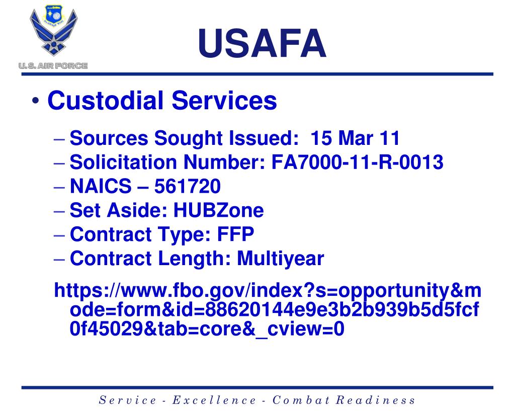 USAFA • Custodial Services • Sources Sought Issued: 15 Mar 11 • Solicitation Number: FA7000-11-R-0013 • NAICS – 561720 • Set Aside: HUBZone • Contract Type: FFP • Contract Length: Multiyear https://www.fbo.gov/index?s=opportunity&mode=form&id=88620144e9e3b2b939b5d5fcf0f45029&tab=core&_cview=0