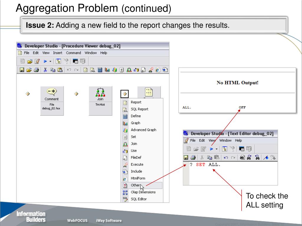 Aggregation Problem Solution Issue 2: Adding a new field to the report changes the results. Solution: Either set ALL to ON or declare a left outer JOIN. Note: Inner and Left OuterJOINs override the ALL setting