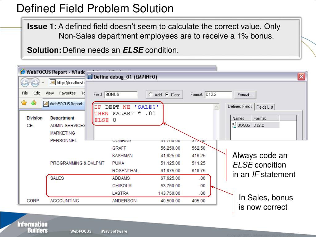 Defined Field Problem Solution Issue 1: A defined field doesn’t seem to calculate the correct value. Only Non-Sales department employees are to receive a 1% bonus. Solution: Define needs an ELSE condition. Always code anELSE conditionin an IF statement In Sales, bonusis now correct