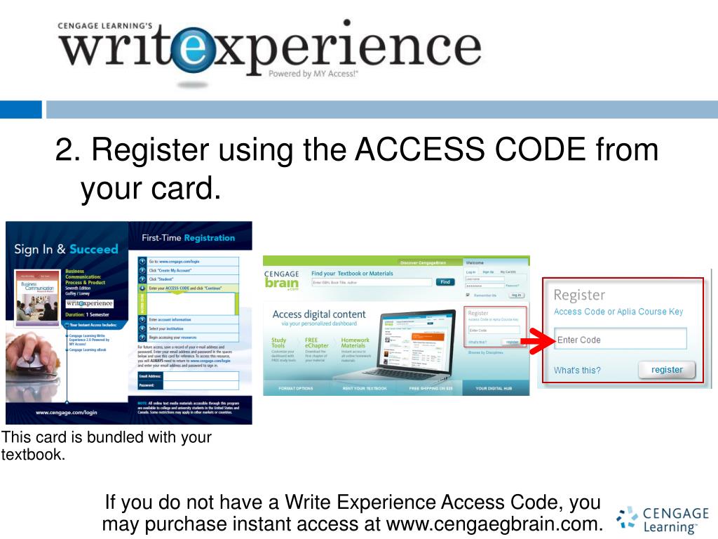2. Register using the ACCESS CODE from your card. This card is bundled with your textbook. If you do not have a Write Experience Access Code, you may purchase instant access at www.cengaegbrain.com.