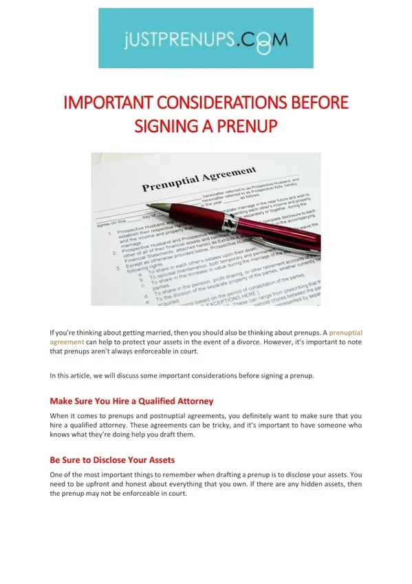 IMPORTANT CONSIDERATIONS BEFORE IMPORTANT CONSIDERATIONS BEFORE SIGNING A PRENUP SIGNING A PRENUP If you’re thinking about getting married, then you should also be thinking about prenups. Aprenuptial agreement can help to protect your assets in the event of a divorce. However, it’s important to note that prenups aren’t always enforceable in court. In this article, we will discuss some important considerations before signing a prenup. Make Sure You Hire a Qualified Attorney When it comes to prenups and postnuptial agreements, you definitely want to make sure that you hire a qualified attorney. These agreements can be tricky, and it’s important to have someone who knows what they’re doing help you draft them. Be Sure to Disclose Your Assets One of the most important things to remember when drafting a prenup is to disclose your assets. You need to be upfront and honest about everything that you own. If there are any hidden assets, then the prenup may not be enforceable in court.
