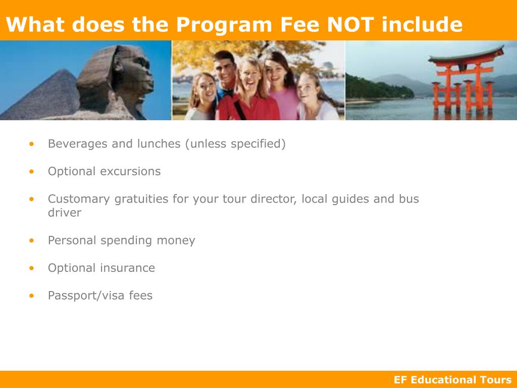 What does the Program Fee NOT include • Beverages and lunches (unless specified) • Optional excursions • Customary gratuities for your tour director, local guides and bus driver • Personal spending money • Optional insurance • Passport/visa fees