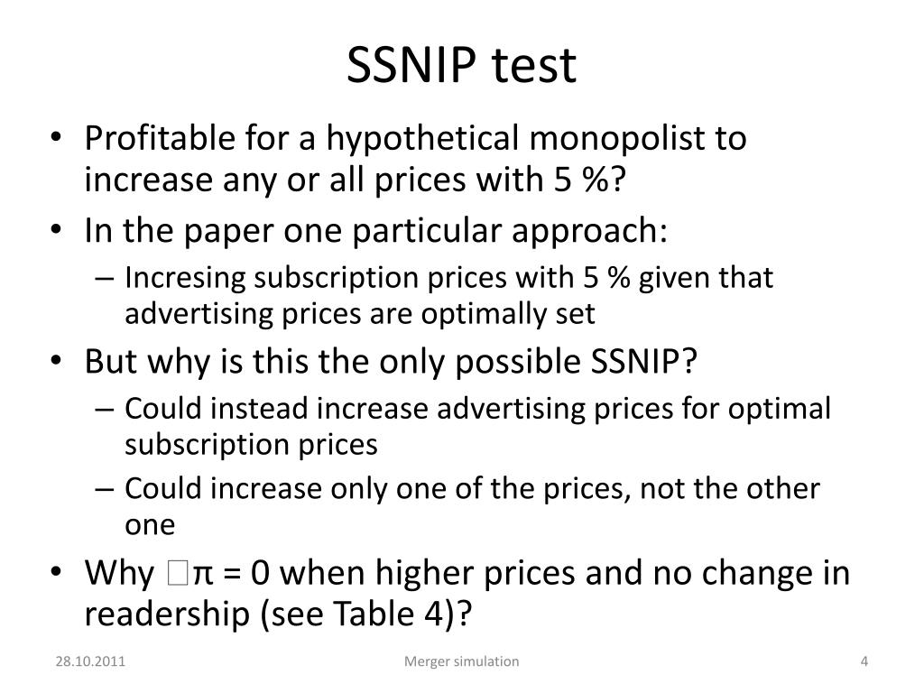SSNIP test • Profitable for a hypothetical monopolist to increaseany or all priceswith 5 %? • In thepaperoneparticularapproach: • Incresingsubscriptionpriceswith 5 % given thatadvertisingpricesareoptimallyset • Butwhy is thistheonlypossible SSNIP? • Couldinsteadincreaseadvertisingprices for optimal subscriptionprices • Couldincreaseonlyoneoftheprices, not theotherone • Whyπ = 0 whenhigherprices and nochange in readership (seeTable 4)? Merger simulation