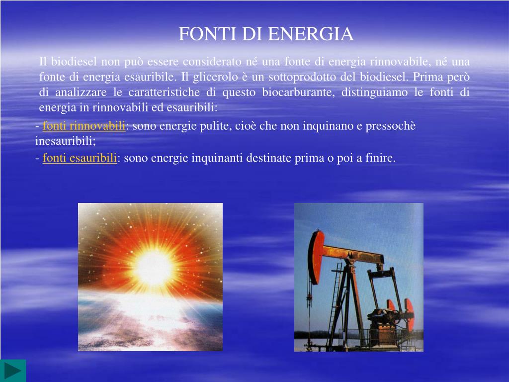 FONTI DI ENERGIA Il biodiesel non può essere considerato né una fonte di energia rinnovabile, né una fonte di energia esauribile. Il glicerolo è un sottoprodotto del biodiesel. Prima però di analizzare le caratteristiche di questo biocarburante, distinguiamo le fonti di energia in rinnovabili ed esauribili: - fonti rinnovabili: sono energie pulite, cioè che non inquinano e pressochè inesauribili; - fonti esauribili: sono energie inquinanti destinate prima o poi a finire.