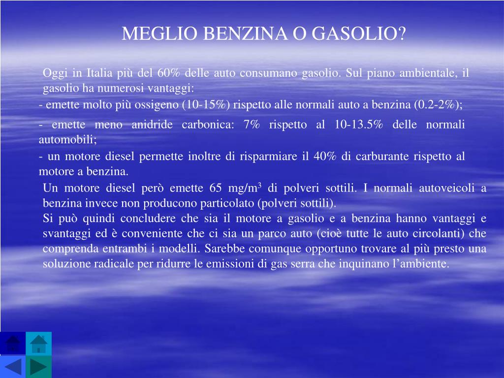 MEGLIO BENZINA O GASOLIO? Oggi in Italia più del 60% delle auto consumano gasolio. Sul piano ambientale, il gasolio ha numerosi vantaggi: - emette molto più ossigeno (10-15%) rispetto alle normali auto a benzina (0.2-2%); - emette meno anidride carbonica: 7% rispetto al 10-13.5% delle normali automobili; - un motore diesel permette inoltre di risparmiare il 40% di carburante rispetto al motore a benzina. Un motore diesel però emette 65 mg/m3 di polveri sottili. I normali autoveicoli a benzina invece non producono particolato (polveri sottili). Si può quindi concludere che sia il motore a gasolio e a benzina hanno vantaggi e svantaggi ed è conveniente che ci sia un parco auto (cioè tutte le auto circolanti) che comprenda entrambi i modelli. Sarebbe comunque opportuno trovare al più presto una soluzione radicale per ridurre le emissioni di gas serra che inquinano l’ambiente.