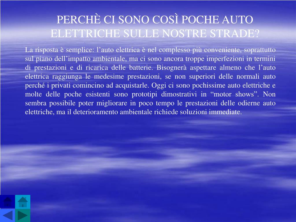 PERCHÈ CI SONO COSÌ POCHE AUTO ELETTRICHE SULLE NOSTRE STRADE? La risposta è semplice: l’auto elettrica è nel complesso più conveniente, soprattutto sul piano dell’impatto ambientale, ma ci sono ancora troppe imperfezioni in termini di prestazioni e di ricarica delle batterie. Bisognerà aspettare almeno che l’auto elettrica raggiunga le medesime prestazioni, se non superiori delle normali auto perché i privati comincino ad acquistarle. Oggi ci sono pochissime auto elettriche e molte delle poche esistenti sono prototipi dimostrativi in “motor shows”. Non sembra possibile poter migliorare in poco tempo le prestazioni delle odierne auto elettriche, ma il deterioramento ambientale richiede soluzioni immediate.