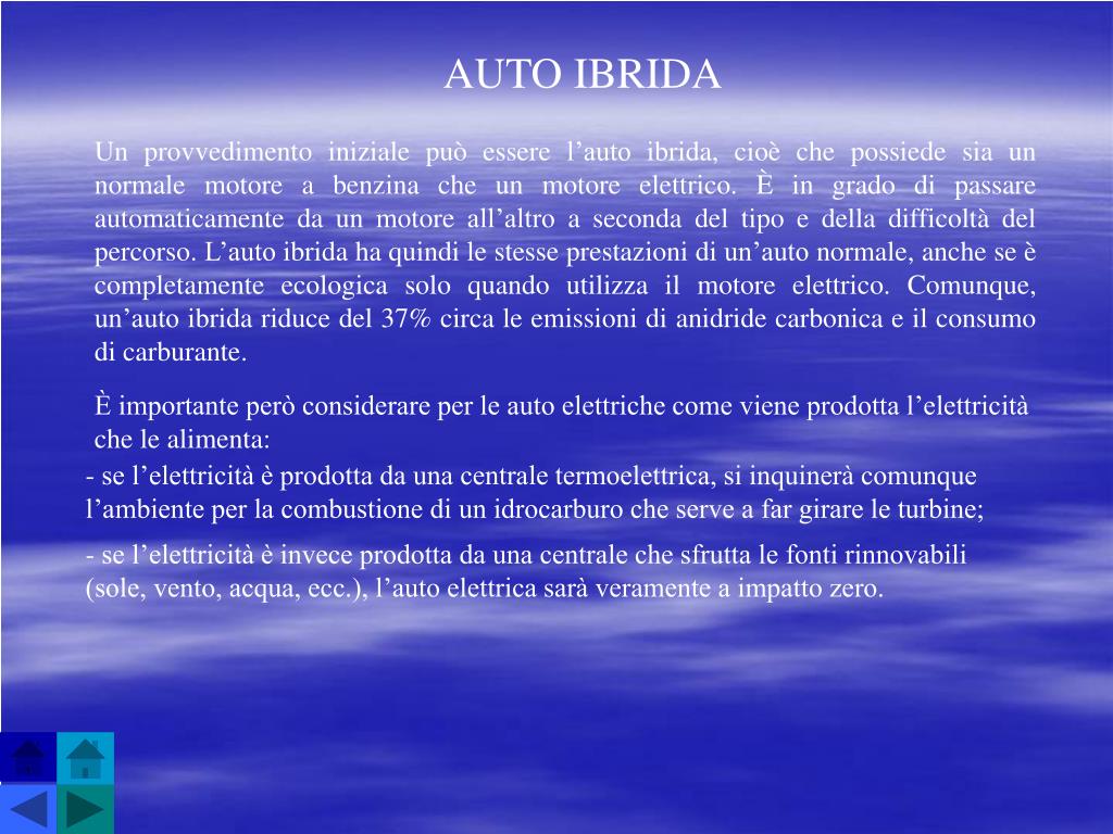AUTO IBRIDA Un provvedimento iniziale può essere l’auto ibrida, cioè che possiede sia un normale motore a benzina che un motore elettrico. È in grado di passare automaticamente da un motore all’altro a seconda del tipo e della difficoltà del percorso. L’auto ibrida ha quindi le stesse prestazioni di un’auto normale, anche se è completamente ecologica solo quando utilizza il motore elettrico. Comunque, un’auto ibrida riduce del 37% circa le emissioni di anidride carbonica e il consumo di carburante. È importante però considerare per le auto elettriche come viene prodotta l’elettricità che le alimenta: - se l’elettricità è prodotta da una centrale termoelettrica, si inquinerà comunque l’ambiente per la combustione di un idrocarburo che serve a far girare le turbine; - se l’elettricità è invece prodotta da una centrale che sfrutta le fonti rinnovabili (sole, vento, acqua, ecc.), l’auto elettrica sarà veramente a impatto zero.