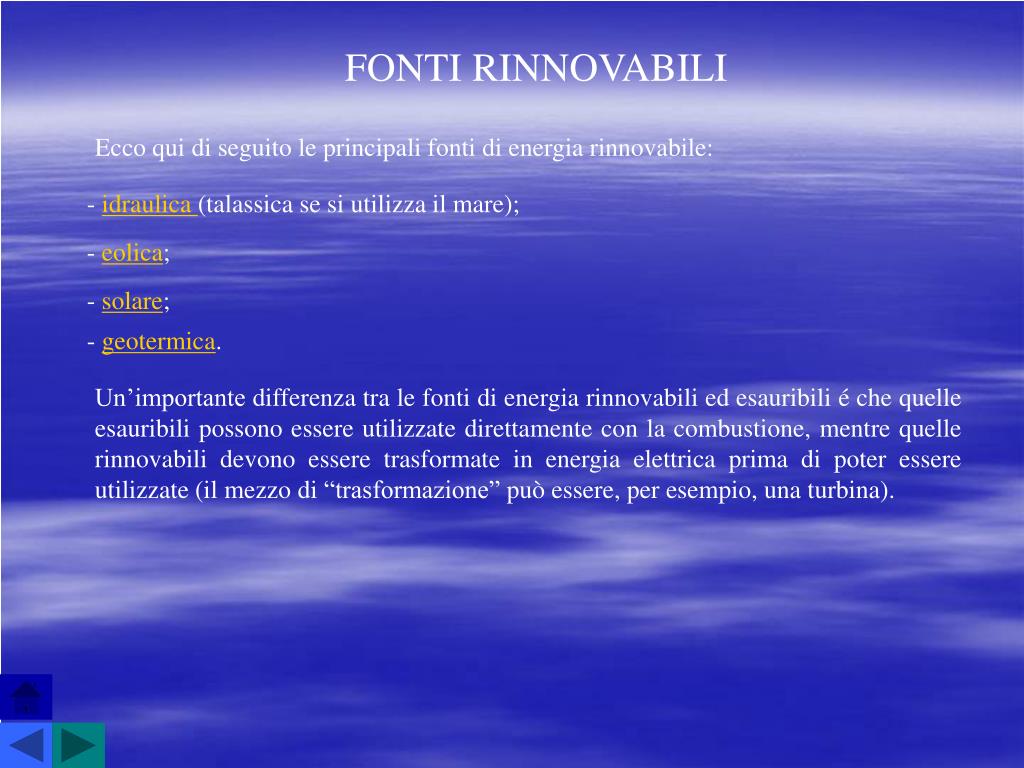 FONTI RINNOVABILI Ecco qui di seguito le principali fonti di energia rinnovabile: - idraulica (talassica se si utilizza il mare); - eolica; - solare; - geotermica. Un’importante differenza tra le fonti di energia rinnovabili ed esauribili é che quelle esauribili possono essere utilizzate direttamente con la combustione, mentre quelle rinnovabili devono essere trasformate in energia elettrica prima di poter essere utilizzate (il mezzo di “trasformazione” può essere, per esempio, una turbina).