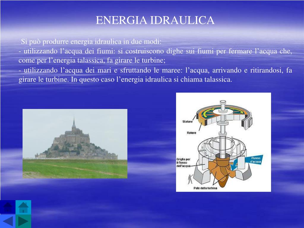 ENERGIA IDRAULICA Si può produrre energia idraulica in due modi: - utilizzando l’acqua dei fiumi: si costruiscono dighe sui fiumi per fermare l’acqua che, come per l’energia talassica, fa girare le turbine; - utilizzando l’acqua dei mari e sfruttando le maree: l’acqua, arrivando e ritirandosi, fa girare le turbine. In questo caso l’energia idraulica si chiama talassica.