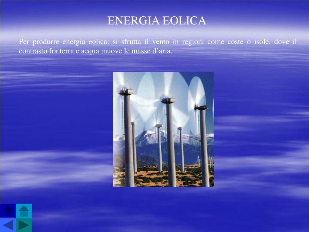 ENERGIA EOLICA Per produrre energia eolica: si sfrutta il vento in regioni come coste o isole, dove il contrasto fra terra e acqua muove le masse d’aria.