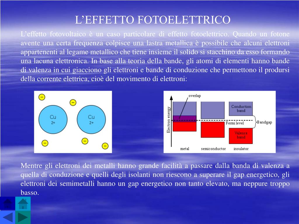 L’EFFETTO FOTOELETTRICO L’effetto fotovoltaico è un caso particolare di effetto fotoelettrico. Quando un fotone avente una certa frequenza colpisce una lastra metallica è possibile che alcuni elettroni appartenenti al legame metallico che tiene insieme il solido si stacchino da esso formando una lacuna elettronica. In base alla teoria della bande, gli atomi di elementi hanno bande di valenza in cui giacciono gli elettroni e bande di conduzione che permettono il prodursi della corrente elettrica, cioè del movimento di elettroni: Mentre gli elettroni dei metalli hanno grande facilità a passare dalla banda di valenza a quella di conduzione e quelli degli isolanti non riescono a superare il gap energetico, gli elettroni dei semimetalli hanno un gap energetico non tanto elevato, ma neppure troppo basso.